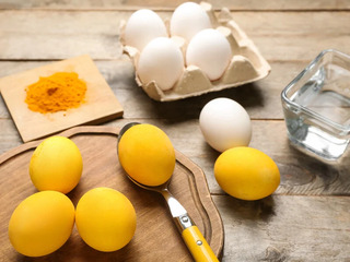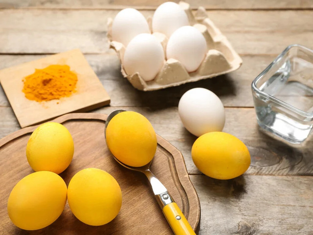 Яйця можна пофарбувати натурально — за допомогою куркуми. Вони виходять гарного яскраво-жовтого кольору. Щоб відтінок був насиченішим, краще готувати їх заздалегідь і залишити у розчині на кілька годин або на ніч.