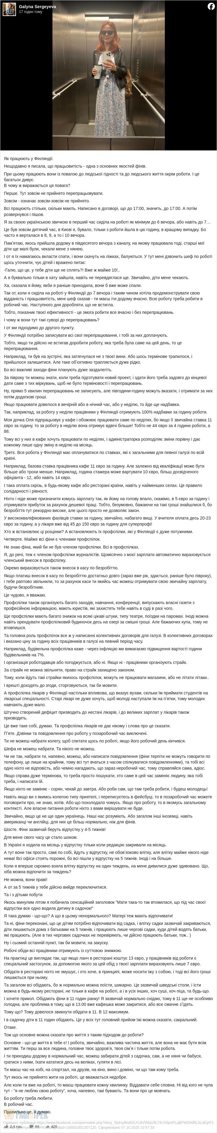 Цього разу її допис про організацію праці та оплату. Галина зазначає, що працьовитість - одна з основних якостей фінів.