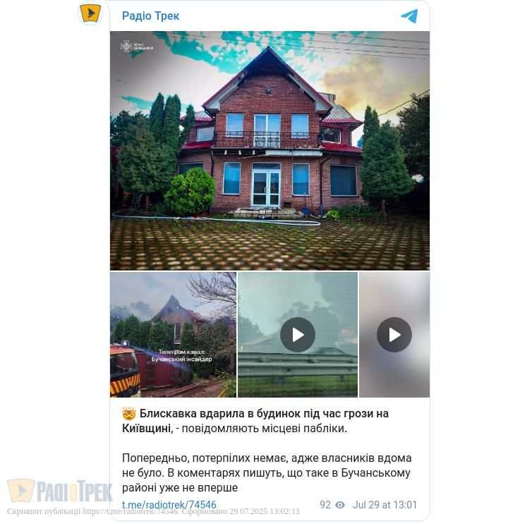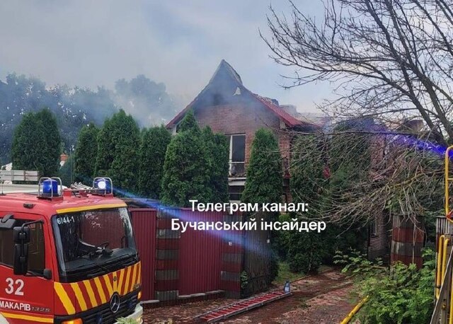 Днями під час грози блискавка влучила у будинок на Київщині. Двоповерхова будівля вигоріла майже вщент. Попередньо, потерпілих немає, адже власників вдома на момент не було.