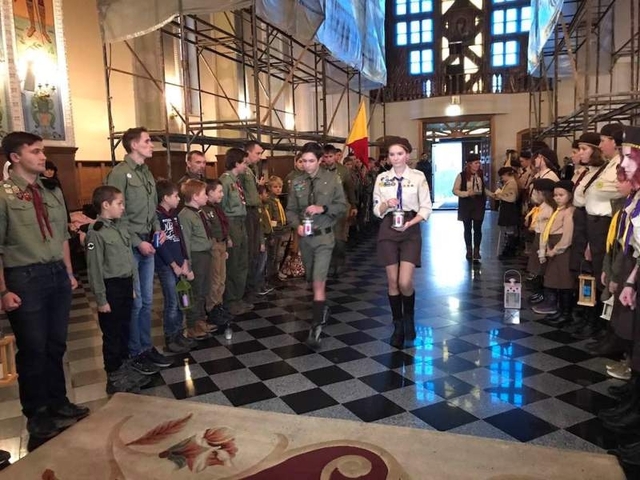 Потім священослужителі проспівали тропар Різдва Христового (пісня, що оспівує зміст церковного свята), а пластуни – пісню про Вифлиємський вогонь.