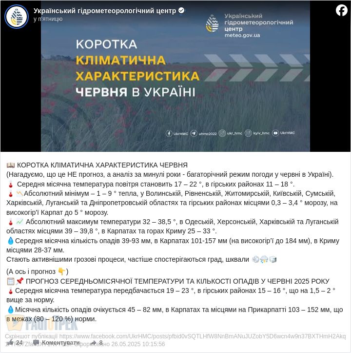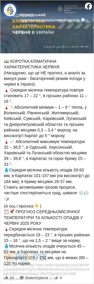 Середня температура повітря впродовж червня буде на рівні +19...+23 градусів. В гірських районах очікується до +15...+16 градусів, що на 1,5-2 градуса вище за норму, – кажуть в Укргідрометцентрі.