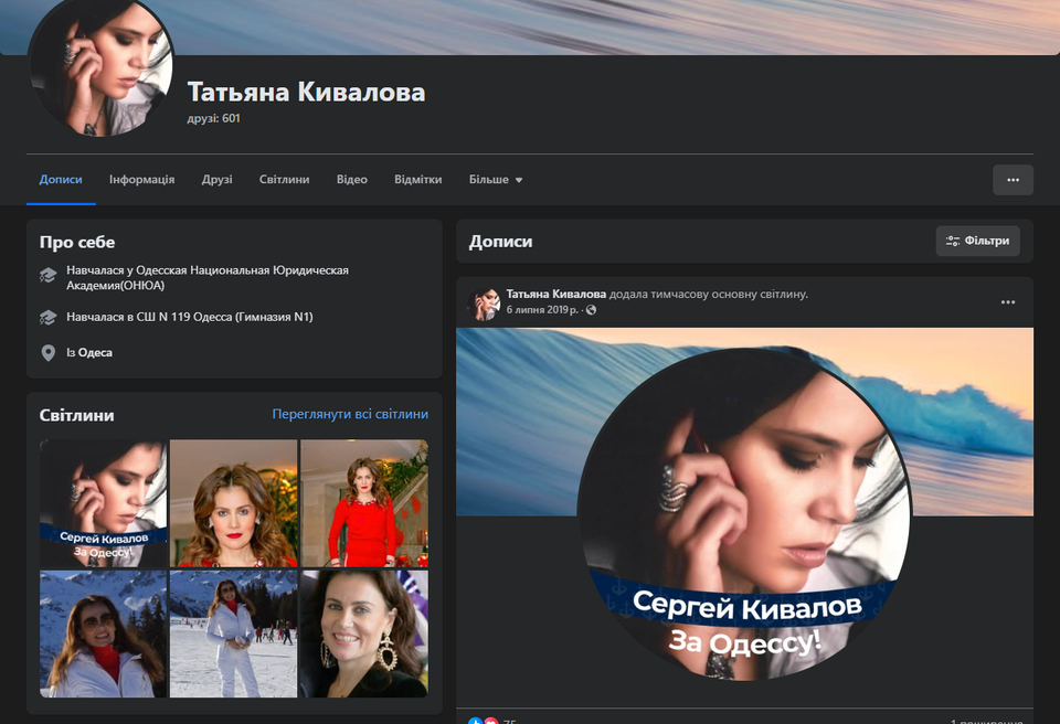 У юристки є сторінка у Фейсбуці, але останній пост у соцмережі датується 2019 роком зі словами «Сергій Ківалов. За Одесу». Тоді нардеп балотувався у ВРУ, але програв вибори висуванцю від «Слуги народу» Олексію Леонову.