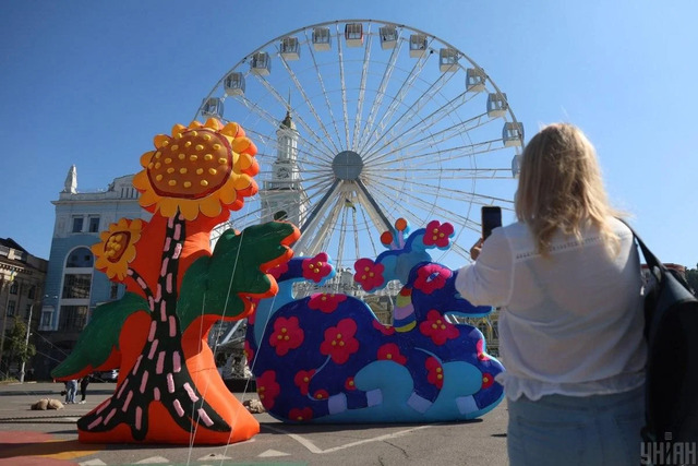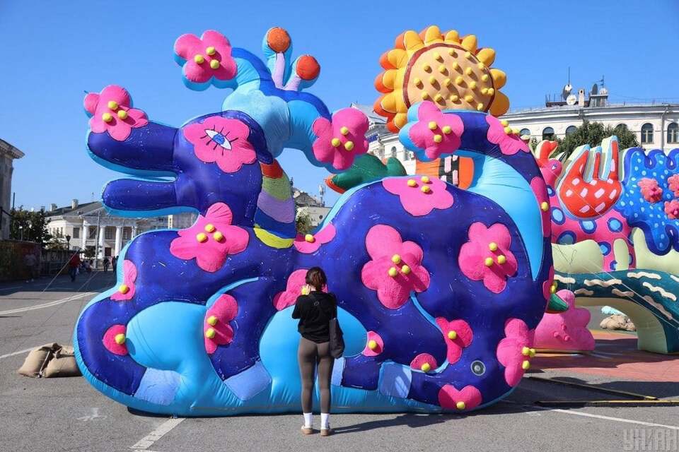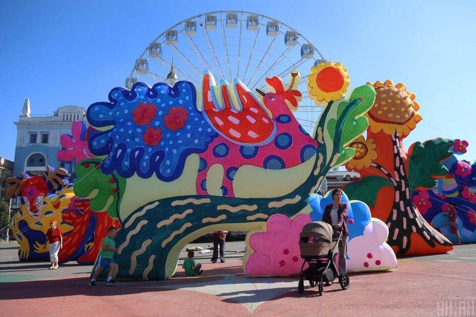 У центрі Києва на Контрактовій площі встановили яскраві інсталяції, натхнені творчістю Марії Примаченко. Їх створили американські художники Адам Фрезза та Террі Чао (CHIAOZZA), пише Уніан.