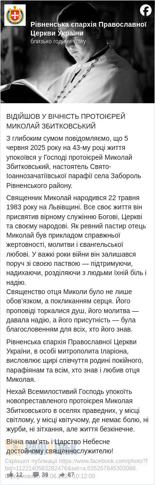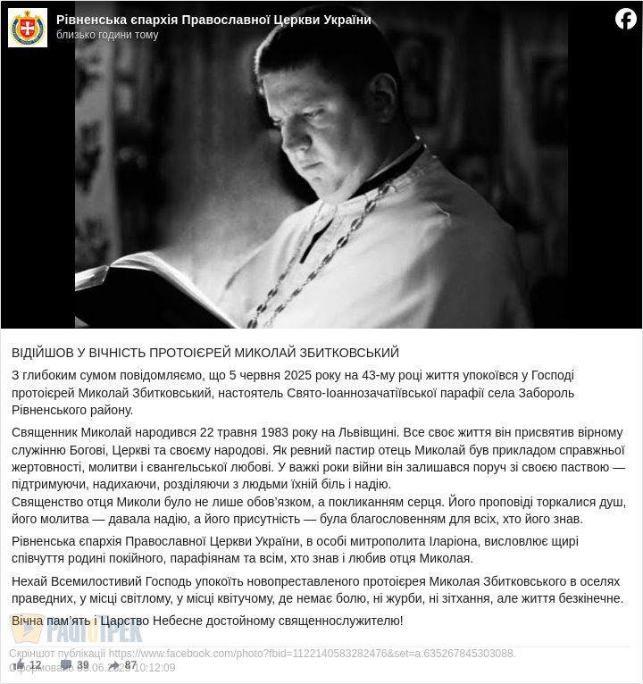 Сьогодні, 5 червня, 43 році з життя пішов настоятель Свято-Іоаннозачатіївської парафії села Забороль Рівненського району, протоієрей Миколай Збитковський.