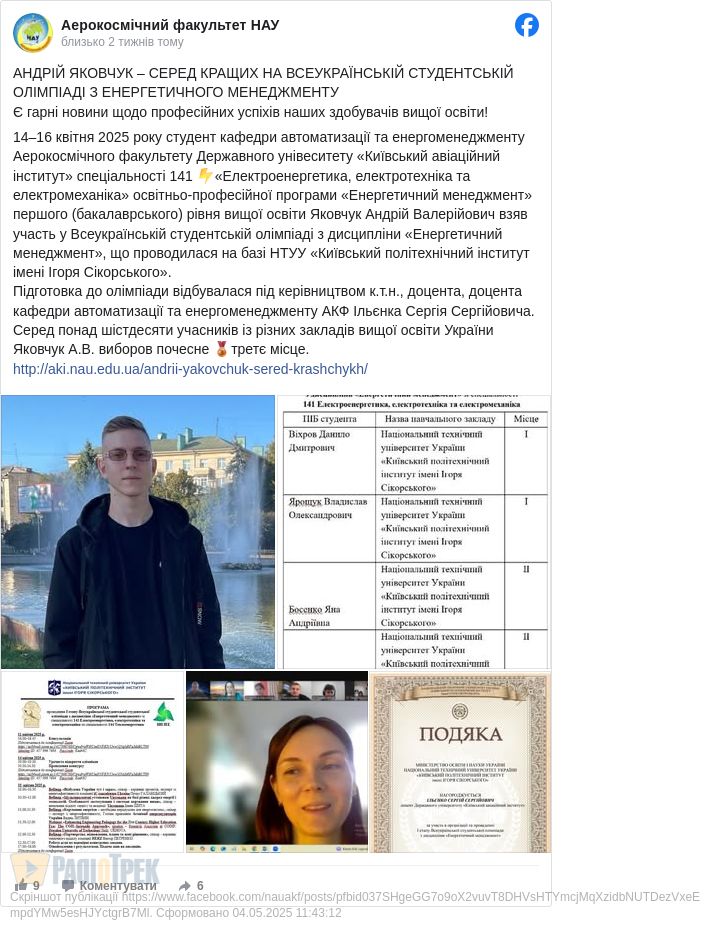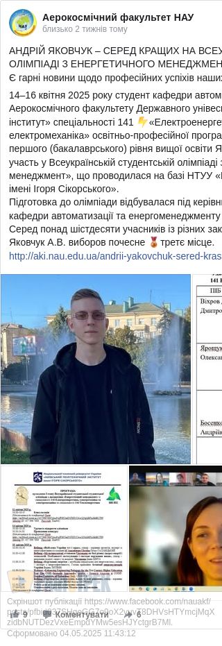 Як ідеться у повідомленні, 14–16 квітня 2025 року студент кафедри автоматизації та енергоменеджменту Аерокосмічного факультету Державного унівеситету «Київський авіаційний інститут» спеціальності 141 «Електроенергетика, електротехніка та електромеханіка» освітньо-професійної програми «Енергетичний менеджмент» першого (бакалаврського) рівня вищої освіти