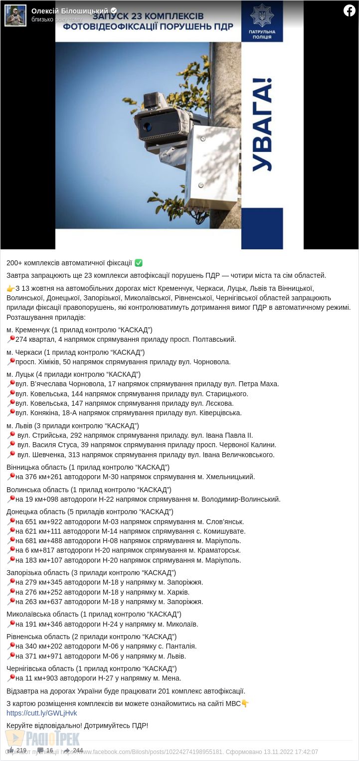 З 13 жовтня на українських автошляхах запрацюють ще 23 комплекси автофіксації порушень ПДР — чотири міста та сім областей.