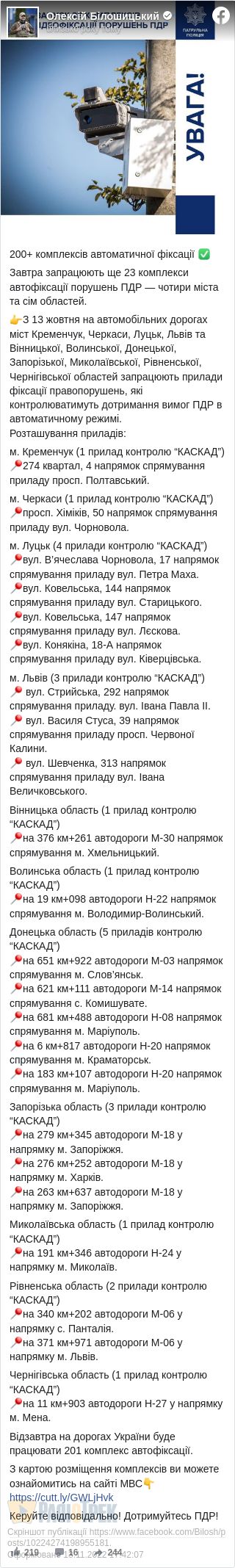 Про це повідомив перший заступник начальника Департаменту патрульної поліції Олексій Білошицький у Facebook.