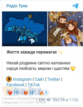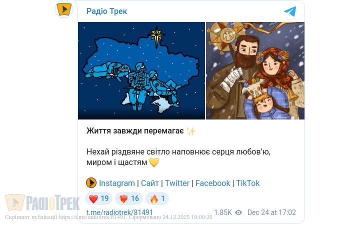 З Різдвом Христовим, рідні українці! Бажаємо вам добробуту, тепла та радості у кожному дні. Нехай скоріше настане перемога! Бережіть себе та нашу країну. З Різдвом!