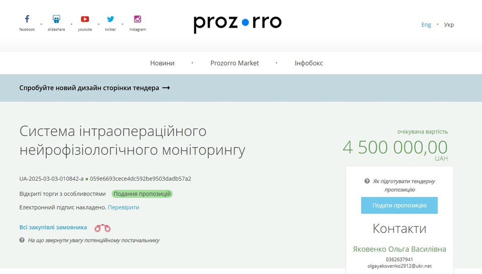 Систему інтраопераційного нейрофізіологічного моніторингу закуплять для своєчасного виявлення небезпечних відхилень під час оперативного втручання.