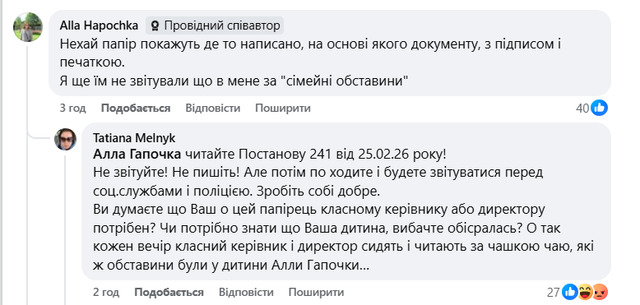 Повідомлення викликало запеклу дискусію серед батьків. Зокрема й згадали про Постанову Кабінету Міністрів України від 25 лютого 2026 р. № 241 «Про внесення змін до Порядку ведення обліку дітей дошкільного, шкільного віку, вихованців та учнів».