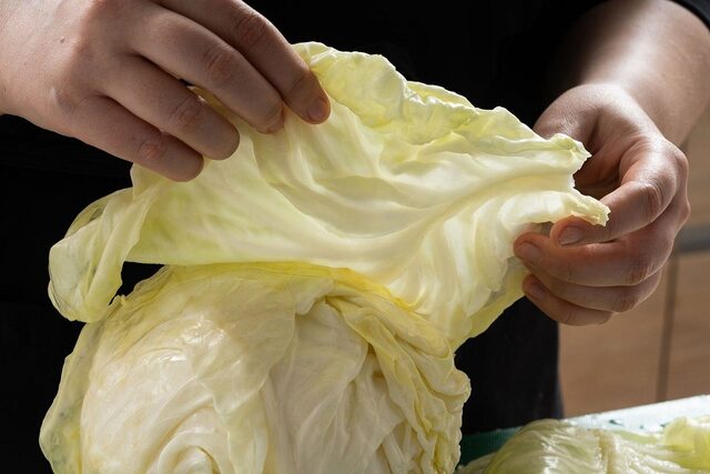 Покладіть капусту у морозильник на 12–24 години, потім повільно розморозьте. Кристали льоду розривають жорсткі волокна, і листи відходять без зусиль.