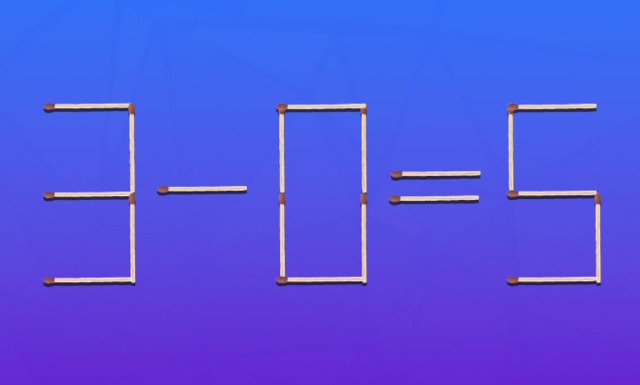 На картинці вище є рівність 3 − 0 = 5, яка неправильна. Ваше завдання – за 20 секунд з допомогою двох сірників зробити так, щоб приклад став правильним.