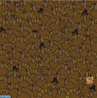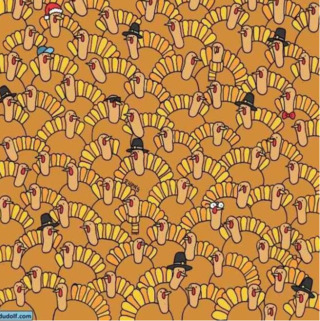 На яскравому зображенні потрібно знайти гарбуз, захований серед індиків. Завдання стане ще цікавішим, якщо ви дасте собі лише 7 секунд на пошук прихованого елементу.