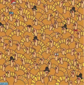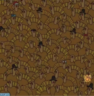 На яскравому зображенні потрібно знайти гарбуз, захований серед індиків. Завдання стане ще цікавішим, якщо ви дасте собі лише 7 секунд на пошук прихованого елементу.