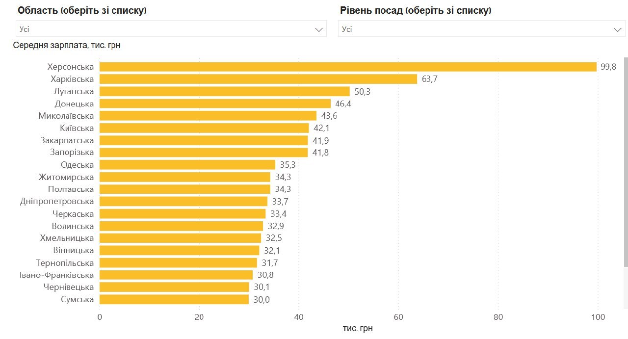 Серед обласних адміністрацій лідирує Херсонська ОВА: середня зарплата чиновників тут сягає 99,8 тис. грн, а керівництво отримує в середньому 257,4 тис. грн.