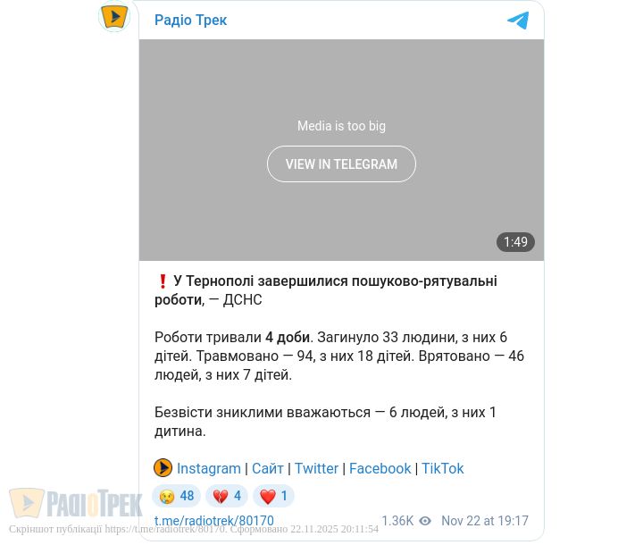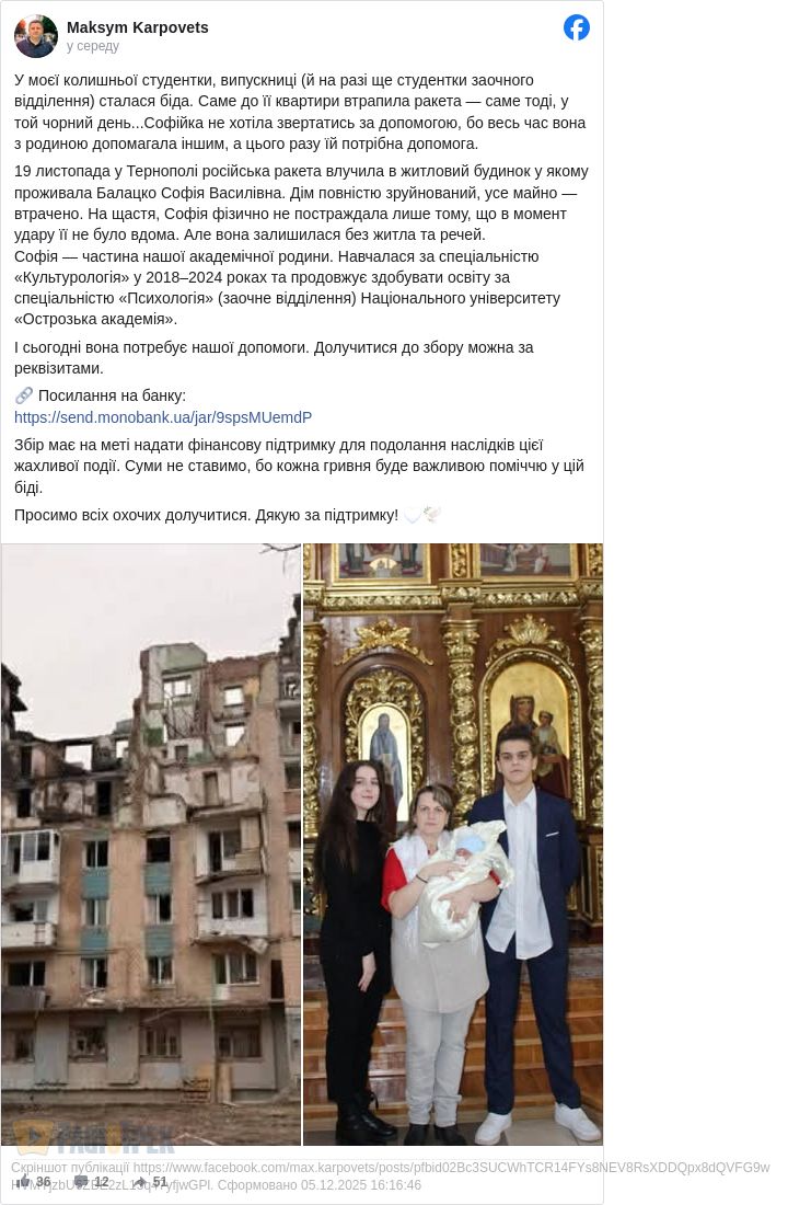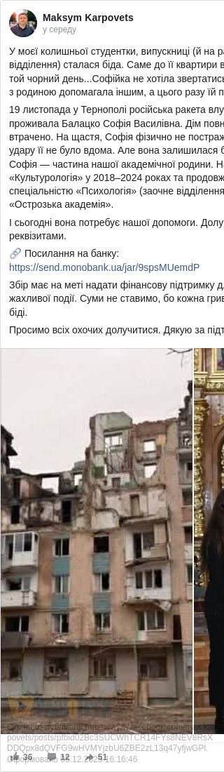 19 листопада у Тернополі російська ракета влучила в житловий будинок, де проживала студентка Національного університету «Острозька академія» Софія Балацко.