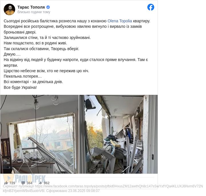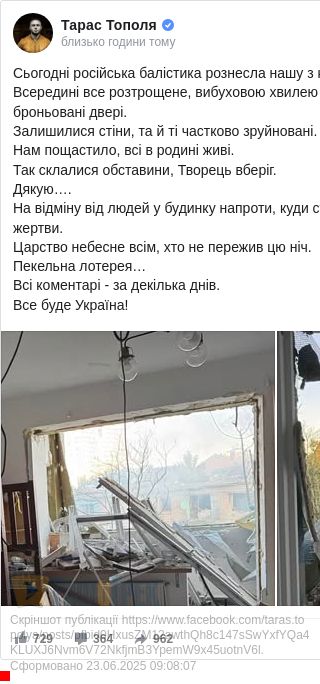 Залишилися стіни, та й ті частково зруйновані. Нам пощастило, всі в родині живі. Так склалися обставини, Творець вберіг. Дякую…. На відміну від людей у будинку напроти, куди сталося пряме влучання. Там є жертви. Царство небесне всім, хто не пережив цю ніч. Пекельна лотерея… Всі коментарі – за декілька днів, – написав Тарас Тополя.