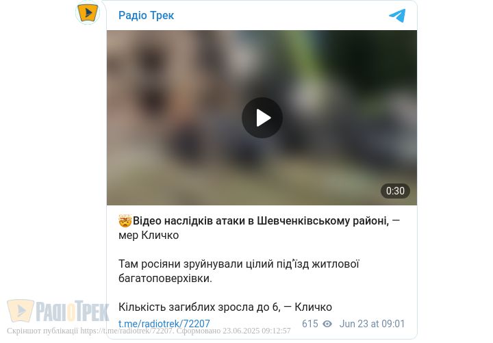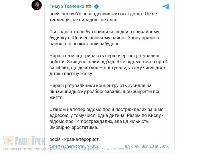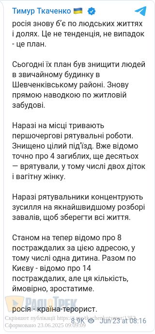 Очільник столичної КМДА Тимур Тищенко повідомив, що внаслідок атаки є руйнування, загиблі та поранені: