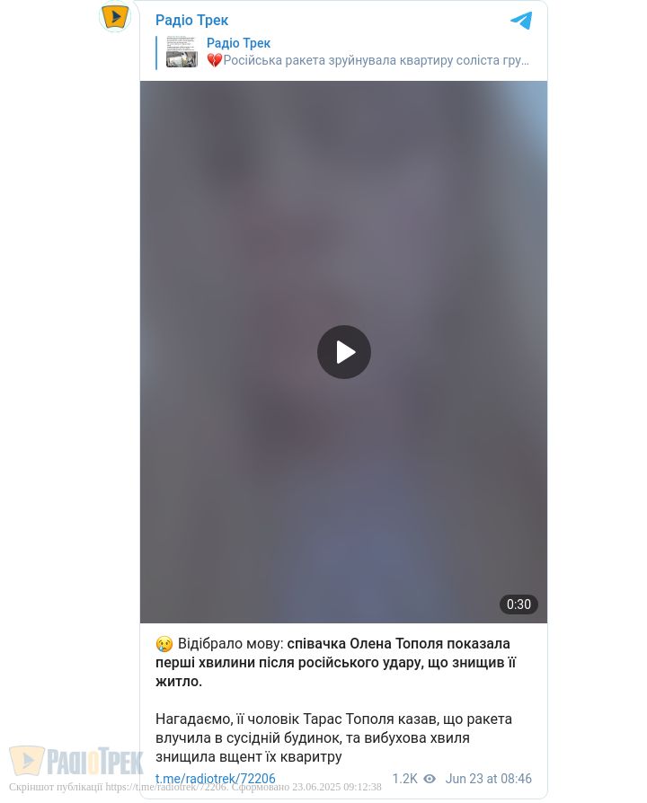 Відомо, що під час ворожих обстрілів балістика зруйнувала квартиру соліста гурту «Антитіла» Тараса Тополі. У мережі виконавець повідомив, що вибухова хвиля вирвала броньовані двері та знищила майже все всередині.