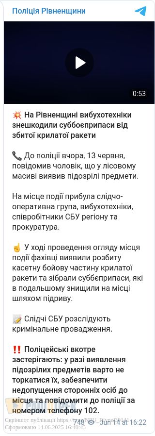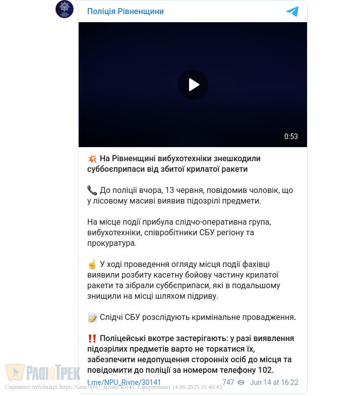 Суббоєприпаси від збитої крилатої ракети знешкодили на Рівненщині.