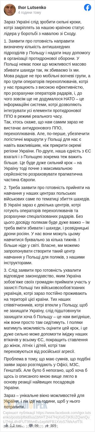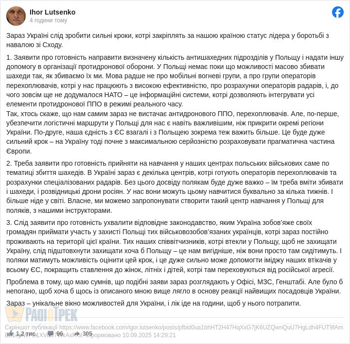- Заявити про готовність направити визначену кількість антишахедних підрозділів у Польщу і надати іншу допомогу в організації протидронової оборони. У Польщі немає поки що можливості масово збивати шахеди так, як збиваємо їх ми. Мова радше не про мобільні вогневі групи, а про групи операторів перехоплювачів, котрі у нас працюють з високою ефективністю, про розрахунки операторів радарів, і, до чого зовсім ще не додумалося НАТО – це інформаційні системи, котрі дозволяють інтегрувати усі елементи протидронової ППО в режимі реального часу.