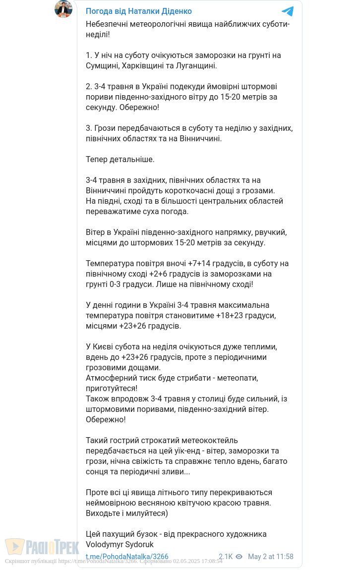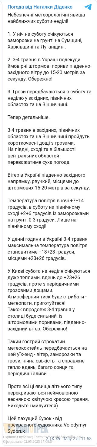 Також ближчими вихідними в Україні ймовірні штормові пориви південно-західного вітру до 15-20 метрів за секунду, а на Заході, Півночі та на Вінниччині можливі грози. На Півдні, Сході та в більшості центральних областей переважатиме суха погода.