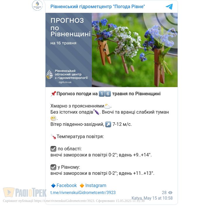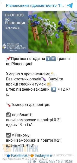 Завтра, 16 травня, у Рівному та області буде хмарно з проясненнями.