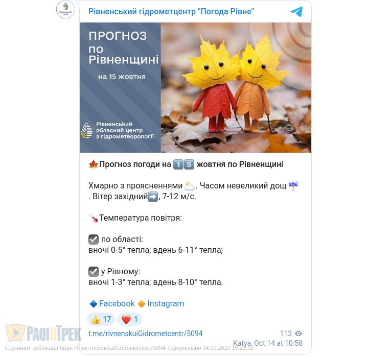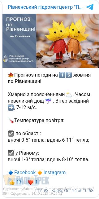 Завтра, 15 жовтня, у Рівному та області буде хмарно з проясненнями.