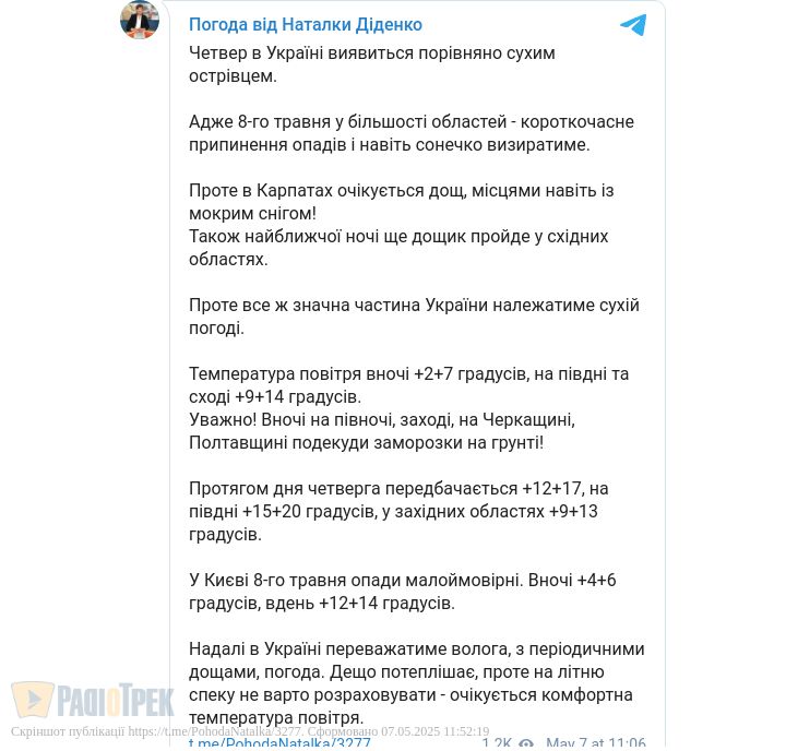 Завтра, 8 травня, в Україні очікується суха погода. У більшості областей буде короткочасне припинення опадів і навіть визирне сонце. У Карпатах очікується дощ, місцями навіть із мокрим снігом, повідомила синоптик Наталка Діденко.