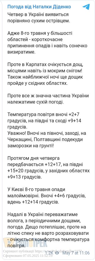 Найближчої ночі температура повітря буде в межах +2...+7 градусів, на Півдні та Сході буде до +9...+14 градусів. Вночі на Півночі, Заході, на Черкащині та Полтавщині можливі заморозки на ґрунті.