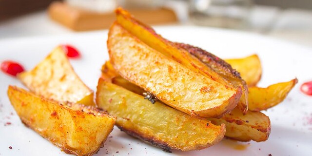Кружечки картоплі в олії викладіть на невеликій відстані один від одного у форму для запікання. Готуйте їх в розігрітій до 250 ° C духовці 15 хвилин.