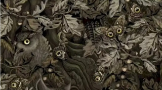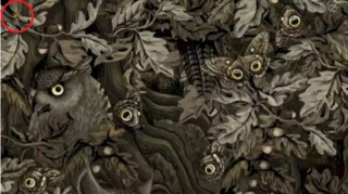 На картинці, що зображена вище, на перший погляд, крім сови, метеликів, жолудів, листя і гілок дуба нічого немає, але там одна прихована гостя – бджола, яку дуже важко помітити