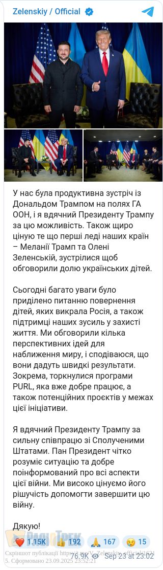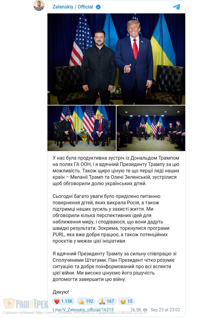 «Дуже хороша зустріч сьогодні була... Вона була, напевно, найбільш наповнена», — сказав Зеленський після розмови з президентом США Трампом на полях Генасамблеї ООН у відповідь на запитання кореспондентки Суспільного.
