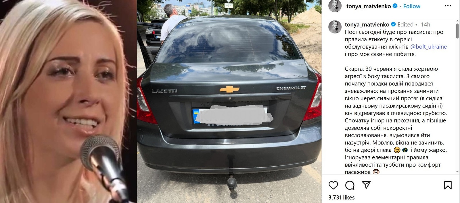 Співачка Тоня Матвієнко повідомила про напад водія таксі під час поїздки сервісом Bolt 30 червня. За її словами, водій вдарив її по голові та плечу.