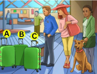 Жінка з собакою має валізу А, на якій є подряпини від її пса. Валіза С з биркою безпеки належить чоловікові в синій сорочці. Валіза В, ймовірно, належить жінці в рожевому капелюсі.