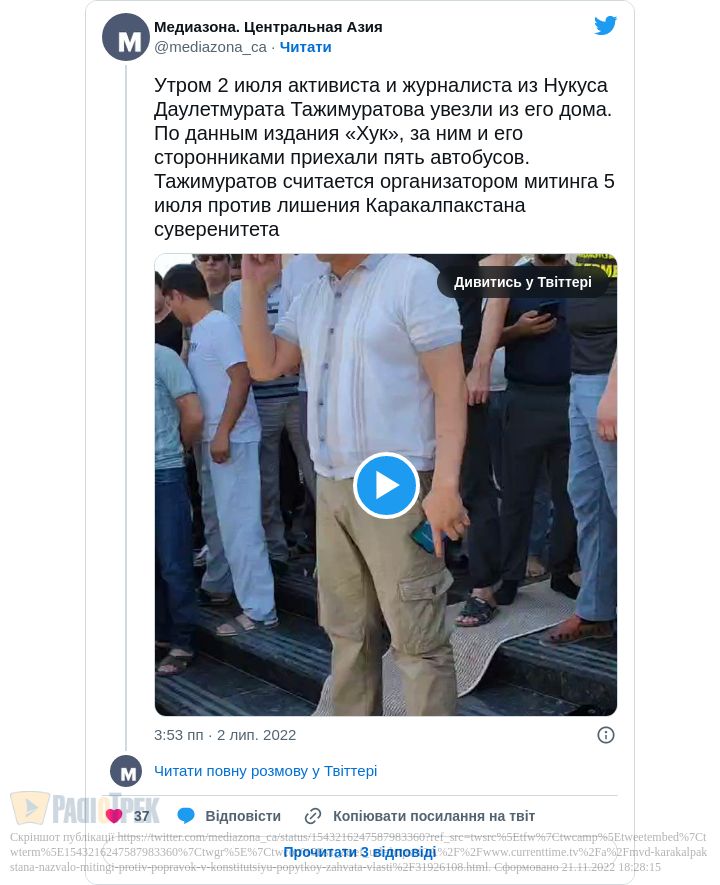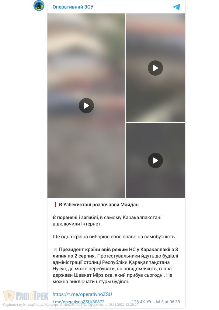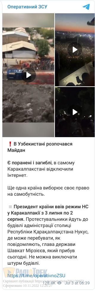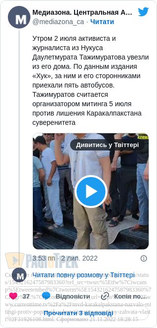 Влада Каракалпакстану, автономної республіки у складі Узбекистану, заявила про «спробу захоплення органів державного управління». Спільна заява МВС і урядових органів республіки з'явилася після масових протестів, що почалися, проти зміни Конституції в Нукусі, столиці Каракалпакстану, та інших містах.