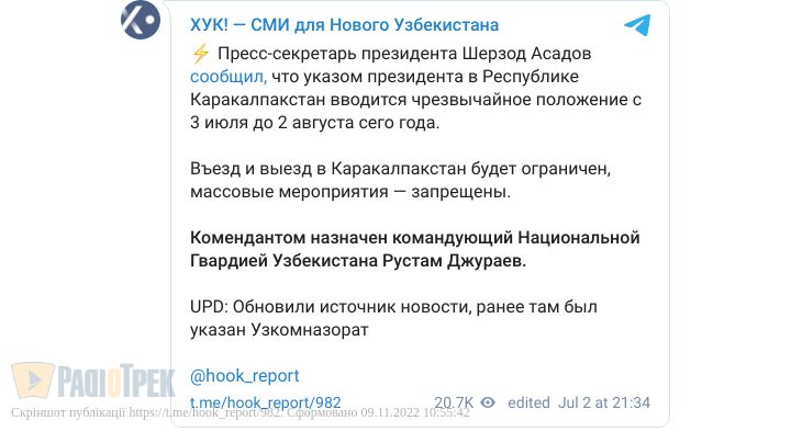 «Хук» також повідомляє, що в'їзд до міста Нукуса перекрито з боку міст Тахіяташ, Ходжейлі, Орак Балга. Крім того, влада Узбекистану закрила пропускний пункт на кордоні Казахстану і Каракалпакстану.