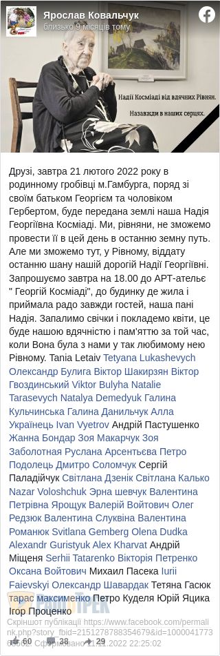 Друзі, завтра 21 лютого 2022 року в родинному гробівці м.Гамбурга, поряд зі своїм батьком Георгієм та чоловіком Гербертом, буде передана землі наша Надія Георгіївна Косміаді.
