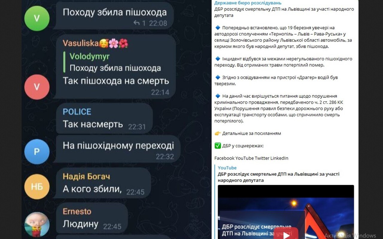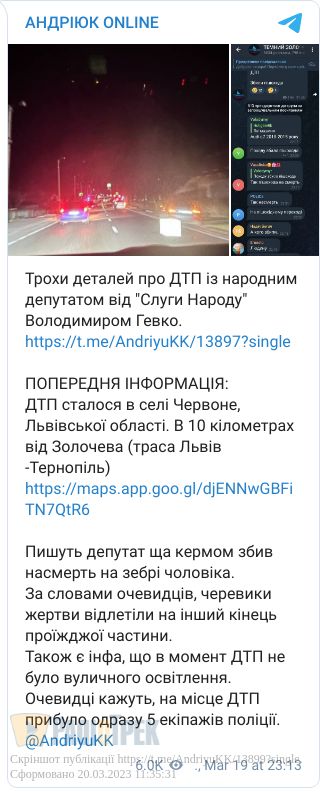 Зокрема, журналіст Костянтин Андріюк у Telegram повідомив, що за попередньою інформацією дорожня аварія сталася в селі Червоне Львівської області. Начебто депутат за кермом збив чоловіка на зебрі й це сталося за 10 км від Золочева на трасі Львів-Тернопіль.