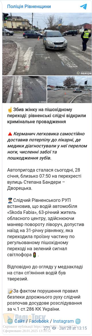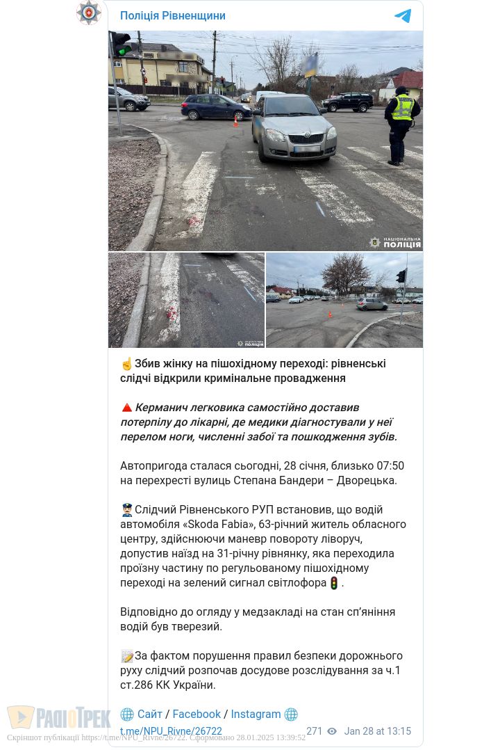 Там 63-річний рівнянин, керуючи легковиком «Skoda Fabia», повертав ліворуч та наїхав на 31-річну жінку. Вона переходила дорогу по регульованому пішохідному переході на зелений сигнал.