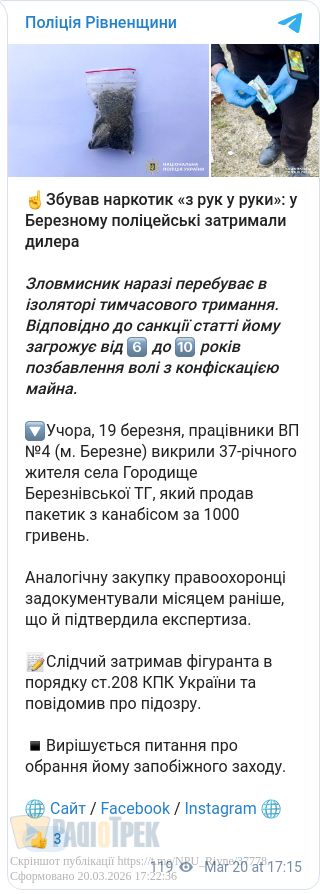 У Березному поліцейські викрили 37-річного жителя села Городище Березнівської громади, який продавав наркотики. Зловмисник наразі перебуває в ізоляторі тимчасового тримання.