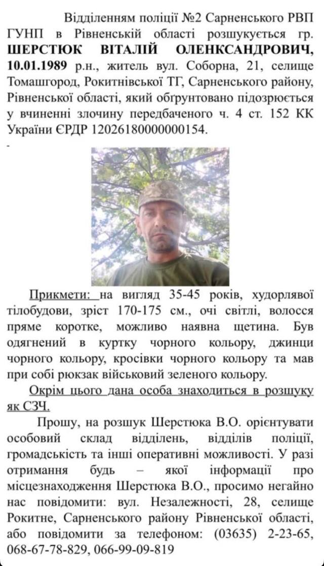 На Сарненщині розшукують зловмисника, який зґвалтував неповнолітню. Орієнтування про чоловіка поширили у соцмережах. Відомо, що він має статус СЗЧ.