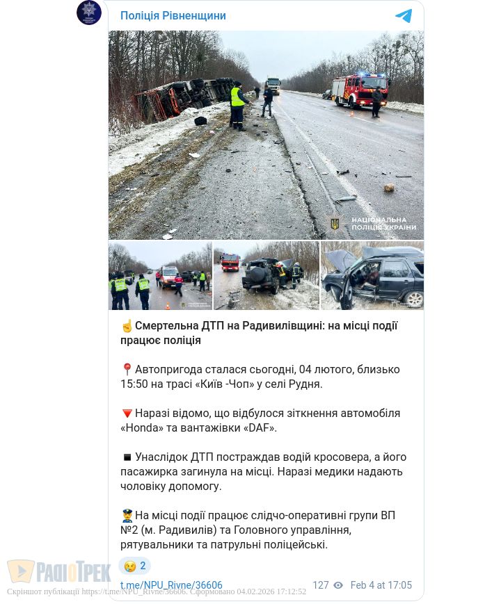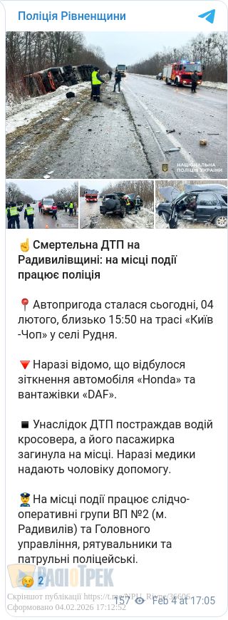Смертельна ДТП сталася на Радивилівщині. Близько 15:50 на трасі Київ -Чоп у селі Рудня не розминулися два транспортні засоби.