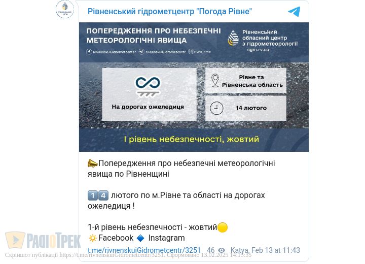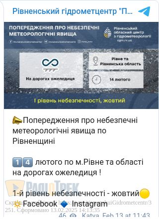 Завтра, 14 лютого, на дорогах Рівного та області очікується ожеледиця.