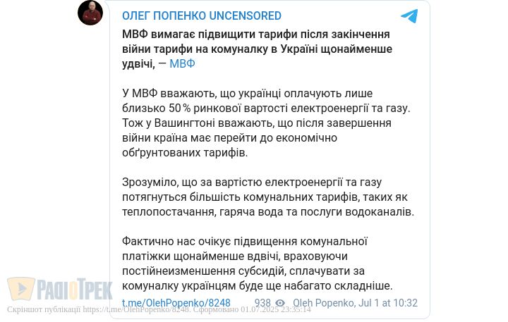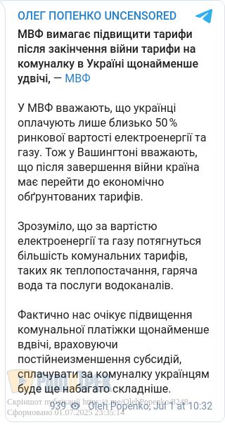 Повернення до реальної ринкової вартості комунальних послуг — одна з ключових вимог МВФ, і Україна має бути готовою до таких змін після перемоги. Це буде непростий етап, але він є необхідним для фінансової стабільності держави.