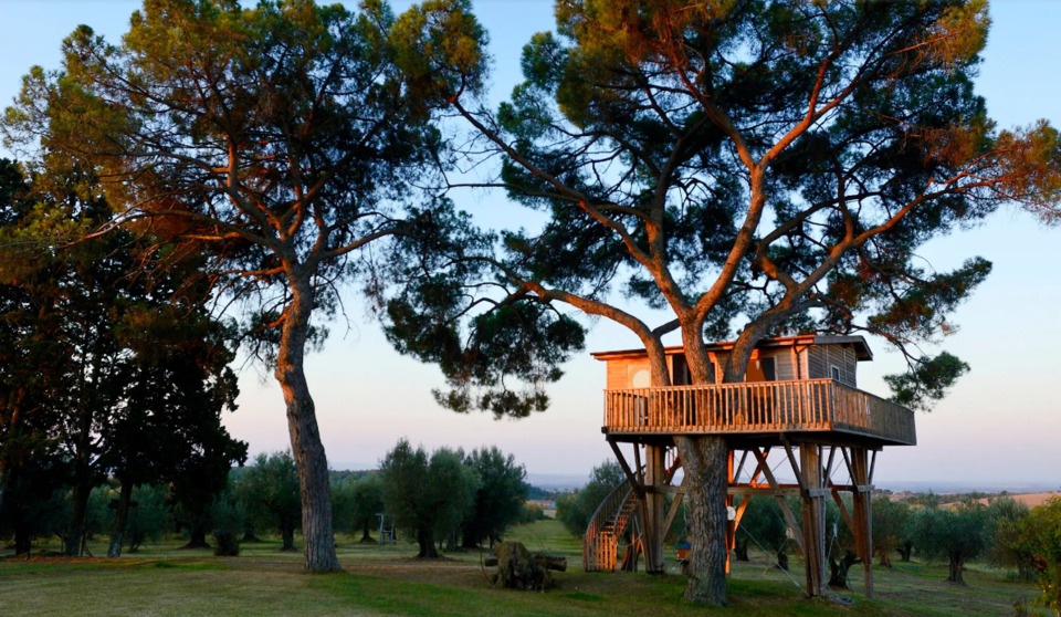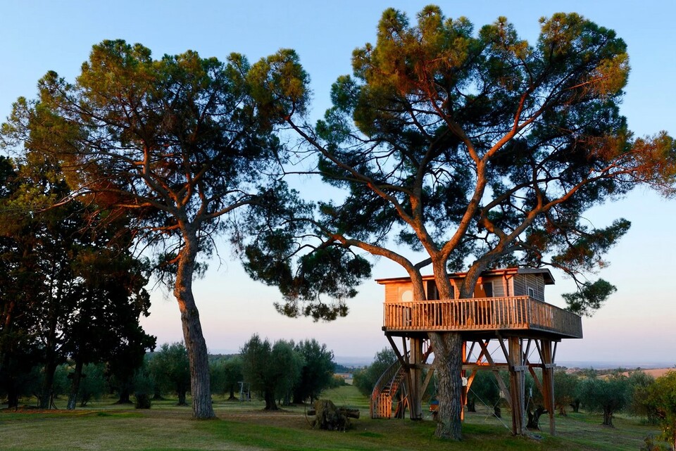 Будиночки на старовинних дубах серед полів. Є балдахіни, вино та мед місцевого виробництва.