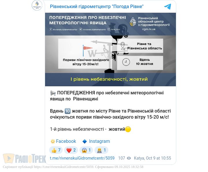 Вітер буде північно-західний, 7-12 м/с, вдень з поривами до 15-20 м/с. У зв’язку з цим в області оголосили І рівень небезпеки, «жовтий».