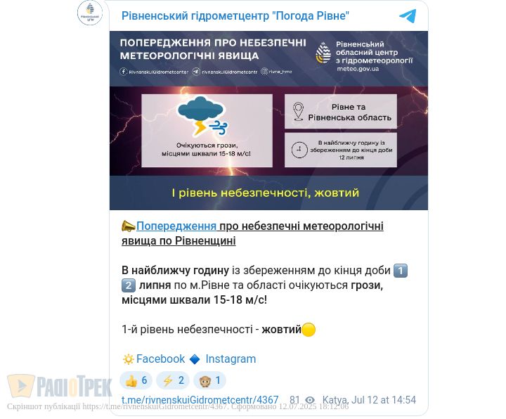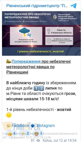 Це І рівень небезпечності, «жовтий», – повідомили у Рівненському гідрометцентрі.