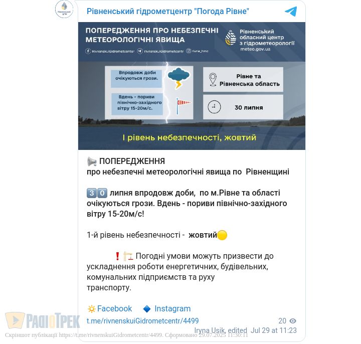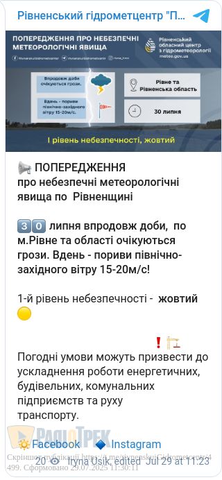 «Жовтий» рівень небезпеки оголосили на Рівненщині