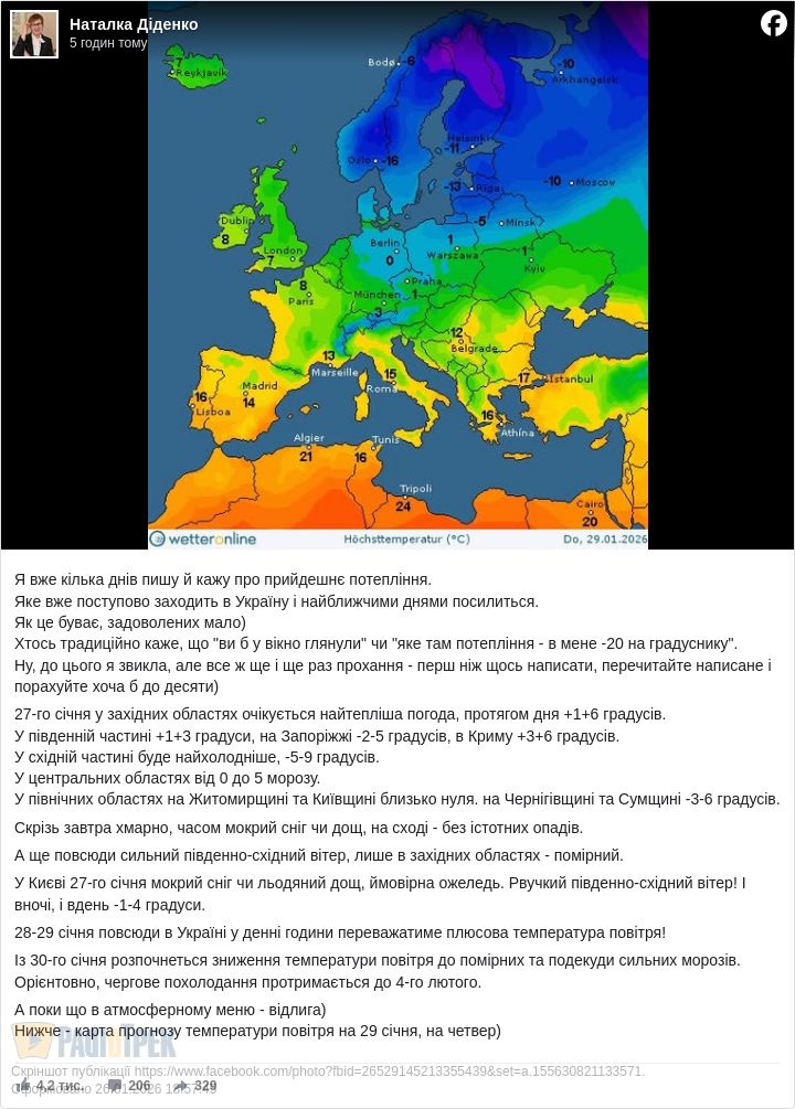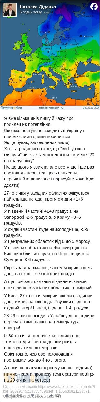 Вже завтра, 27 січня, у деяких областях «мінуси» зміняться на плюси. На Заході очікується до +1...+6 градусів, на Півдні буде +1...+3 градуси, на Запоріжжі – до -2...-5 градусів, повідомила синоптик Наталка Діденко.